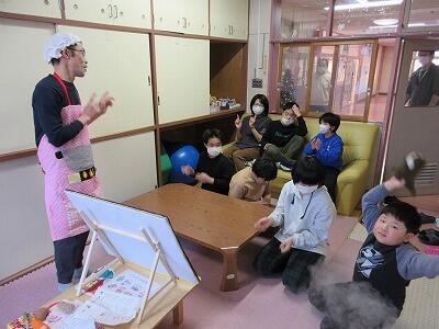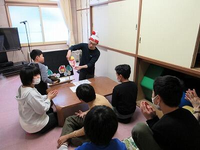 12月18日(木)、お楽しみ会がありました。雪だるまのデザインのケーキを食べ、クリスマスにちなんだクイズや、段ボールの星形の穴からボールが落ちないように転がすゲームをして遊びました。
