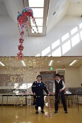 2月25日(水)に、卒業と進級を祝う会を行いました。みんなでケーキを食べてから、今年度、夕食後に食堂の掃除をしてくれた舎生の表彰式を行いました。次に高等部3年生の思い出の動画や担当指導員からのビデオレター、1年間の行事の様子の動画も見ました。自分が映っているのを見て喜ぶ舎生や、動画の音楽に合わせて踊り出す舎生もいて盛り上がりました。色紙贈呈のあと、お礼の言葉を発表し、最後にくす玉を割りました。くす玉から飾りがひらひらと舞い降り、おめでとうの文字が現れるとみんな歓声を上げていました。