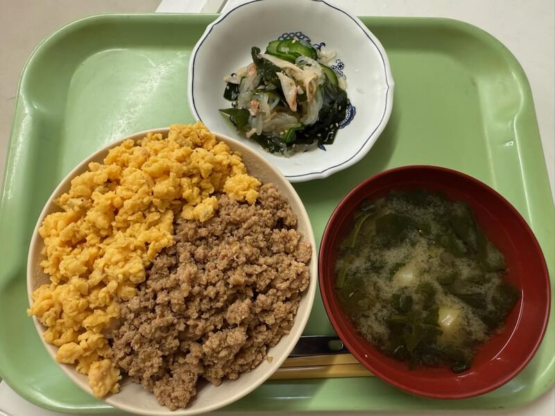 二色丼の具は、①豚ひき肉、玉ねぎ、生姜を使った具材と②炒り卵を使用しました。どちらもごはんが進む味付けで、家庭でも食べ慣れているからか、みなさん食べ進みが早かったです。
