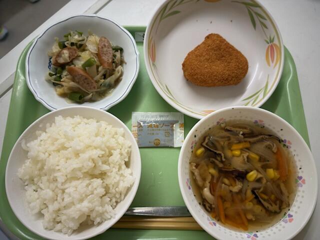 次は・・・ごはん、オニオンスープ、焼き栗コロッケ、キャベツのソテーです。
