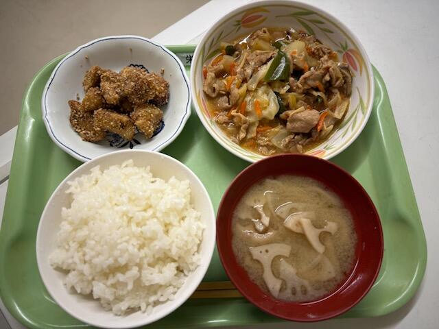 次は・・・ごはん、旬のみそ汁(れんこん)、秋の和風回鍋肉、揚げ里芋のごまあえです。「秋の味覚献立」として提供をしました。