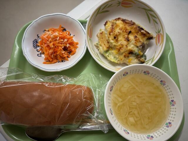 次は・・・卵パン、キャベツのコンソメスープ、チキンマカロニグラタン、人参サラダです。