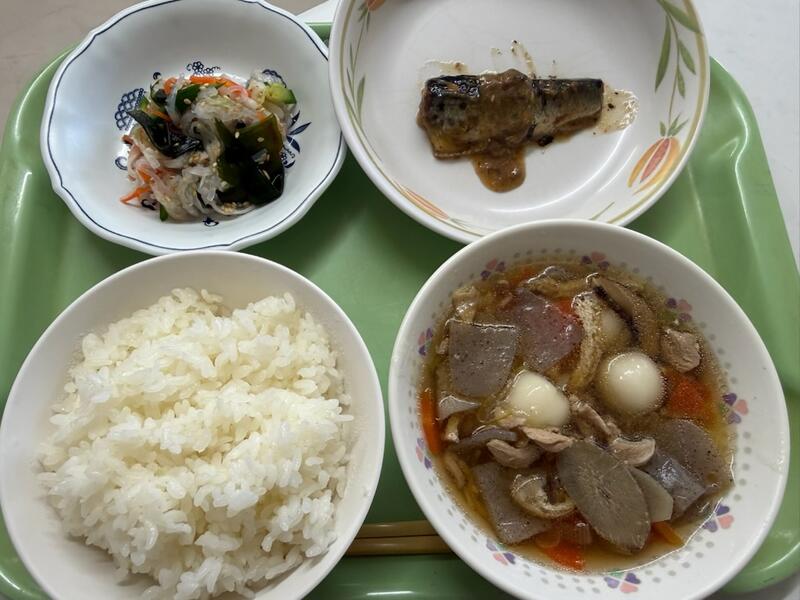 ごはん、白玉雑煮汁、いわしのみそ煮、七色なます