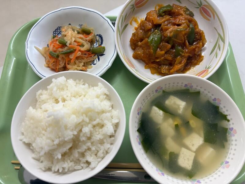 ごはん、わかめスープ、ぶたチリ、大根の中華サラダ