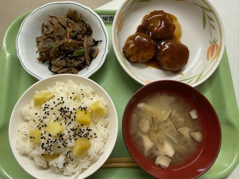 さつまいもごはん、旬のみそ汁(まいたけ)、野菜入り鶏つくね、五目きんぴらごぼう