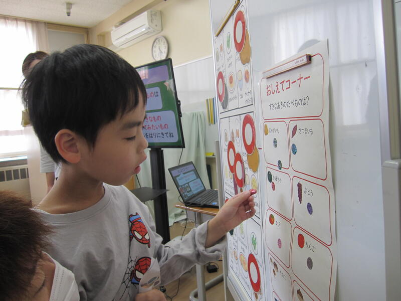 秋の食べ物の中で、好きな食べ物や食べてみたい食べ物にシールを貼ってもらいました♪