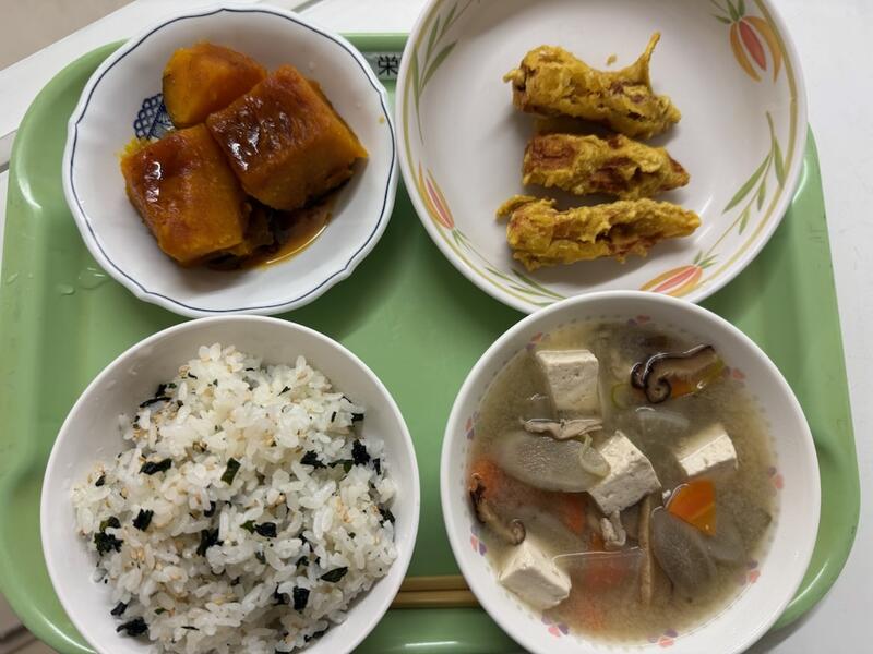 ちくわにカレー粉を混ぜた衣をつけて、調理員さんが揚げてくれました。かぼちゃも味がしっかり染みています。とりみそ汁は、鶏肉や野菜のうま味が・・・♪そして体が温まり、わかめごはんがどんどん進みます!